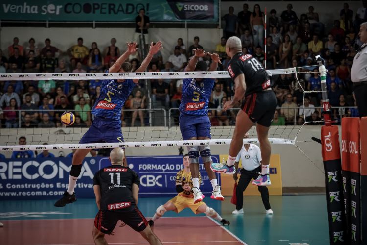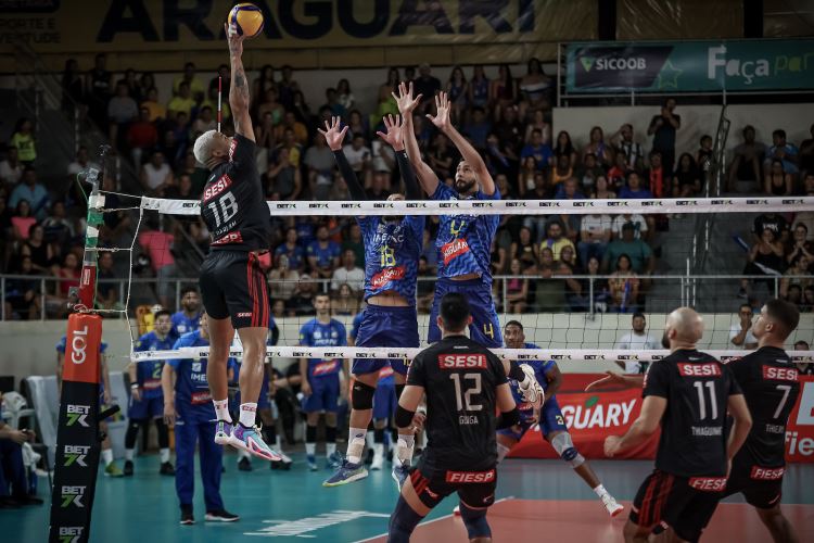 O Sesi Bauru venceu o Araguari Vôlei por 3 a 2 (24/26, 18/25, 25/23, 25/23 e 15/13), nesta sexta-feira, em Araguari (MG), no segundo duelo das quartas de final da Superliga Bet7K 2023/2024.