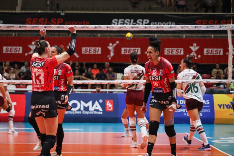 O primeiro set começa muito equilibrado, com ambos os times trocando pontos e tendo boa virada de bola. O Sesi Vôlei Bauru começa sofrendo mais com a recepção, mas vira o placar e tem a primeira vantagem do jogo em 11 a 9, após boa passagem de saque de Mayhara, forçando o primeiro pedido de tempo do Fluminense. O time bauruense segue forte nos pontos longos, com boa cobertura defensiva convertendo em pontos de contra-ataque. O Fluminense cresce nos bloqueios, limita o ataque da casa e força o primeiro tempo do Sesi Vôlei Bauru em 16 a 15. O time bauruense começa a ter mais erros na formação ofensiva e o time carioca vira o placar em 18 a 19, no segundo pedido de tempo do Sesi Vôlei Bauru. O time da casa recupera a virada de bola e, em mais uma passagem de Mayhara pelo saque, volta a liderar o set em 21 a 19, na segunda parada do Fluminense. O time bauruense tem ótima cobertura defensiva para limitar o time carioca na reta final do set e fecha em 25 a 21, com ataque de Thaisinha.