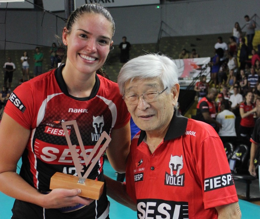 A eleita melhor da partida foi nossa ponteira, Sarah Wilhite, que marcou 17 pontos, sendo a maior pontuadora do Sesi Vôlei Bauru neste jogo, e recebeu o troféu das mãos do representante da Mezzani, Sr Hiroshi.
